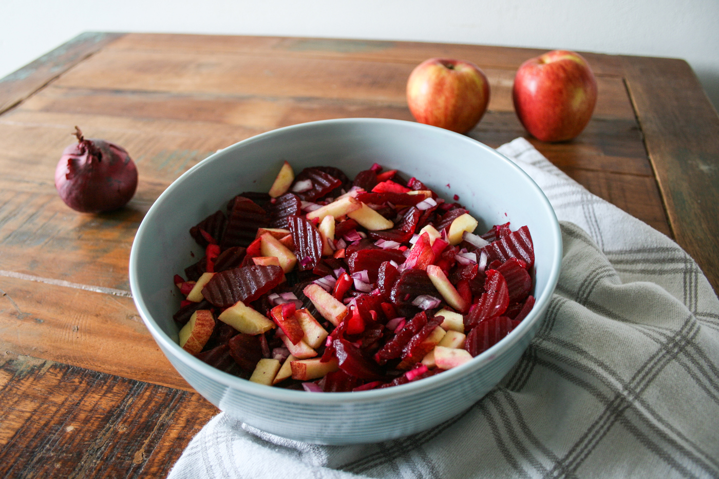 2. Den Apfel in kleine Würfel schneiden und die rote Zwiebel fein hacken. Apfel, Zwiebel und die Rote Beete zum Dressing in die Schüssel geben.