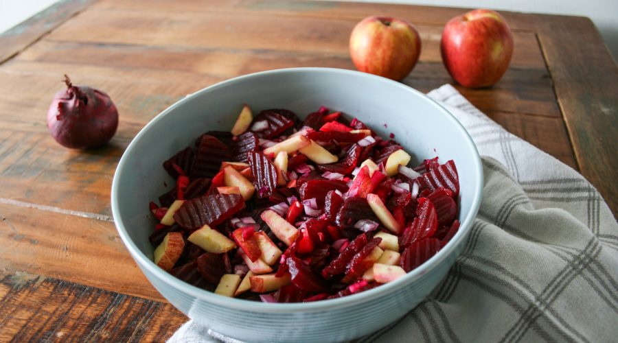 Bei unserem feinen Rote Beete Salat ist der Gegenspieler zum erdigen Geschmack der roten Knolle die feine Süße des Apfels.