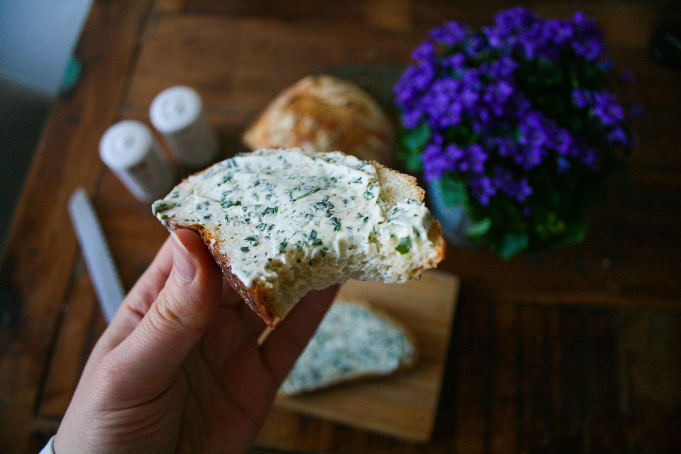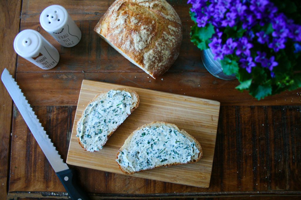 An manchen Tagen braucht es nur ein frisch gebackenes Brot mit selbstgemachter veganer Kräuterbutter, um glücklich in die Küche zu stehen und genussversunken vor sich hinzuknuspern. So ein Töpfchen Kräuterbutter im Kühlschrank ist schon was wert. Nicht nur auf Brot himmlisch, sondern auch zart schmelzend über dampfende Gnocchi, knackiges Gemüse aus der Pfanne oder wenn man einfach keine Lust hat eine Pasta-Soße zu kochen.